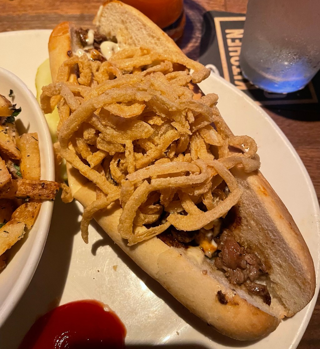 Fried onions were not listed as an option, but I asked for them anyway. Instead of fried onions, I got onion straws. They didn’t add much flavor, but the quantity was…impressive (?). The garlic aioli is creamy and adds a nice flavor to the roll and to the sandwich as a whole. There’s another flavor too, maybe a BBQ or steak sauce. Whatever it is, it’s salty and works well. But, like the onions, this differs from tradition quite a bit.